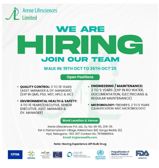 - Pharma Jobs in Arene Lifesciences Ltd | Quality Control/ Environmental/ Microbiology / Engineering Dept. |Apply now