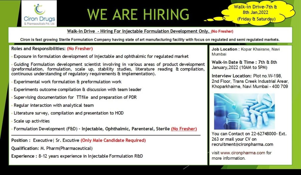 Department of Formulation Development Job 2022, CIRON Pharma Jobs-2022, has published the recruitment for the Formulation Development Departments the desired candidate is requested to take all the information before applying in this private limited company employment and only then apply according to his eligibility. Department of Formulation Development Vacancy 2022